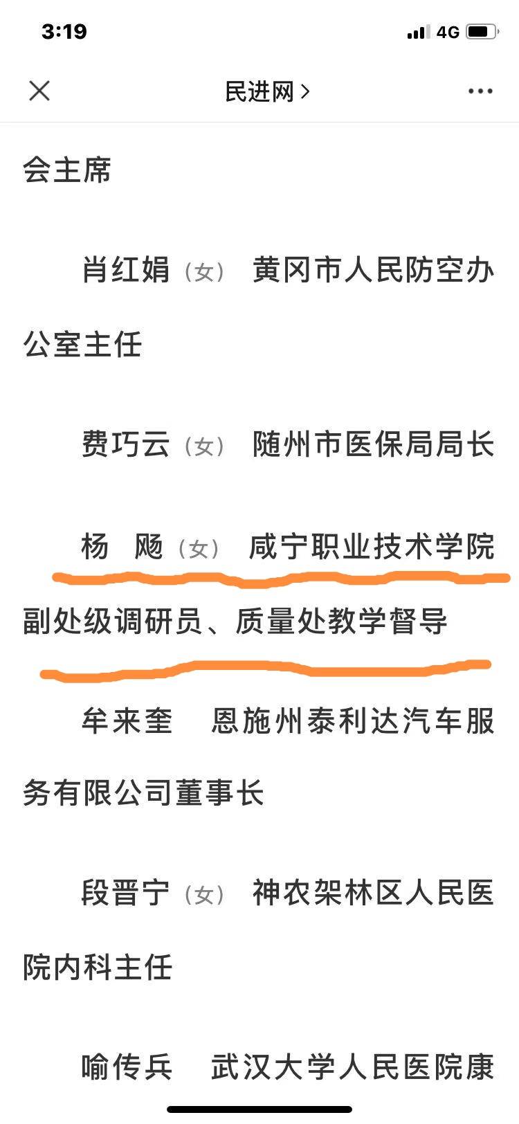 杨飏,咸宁市人大代表,学校副处级调研员,现任学校质量管理处教学督导。该同志对工作兢兢业业、认真负责,在校内督导督查工作中凭借丰富的工作经验,指导青年教师提升教学能力。